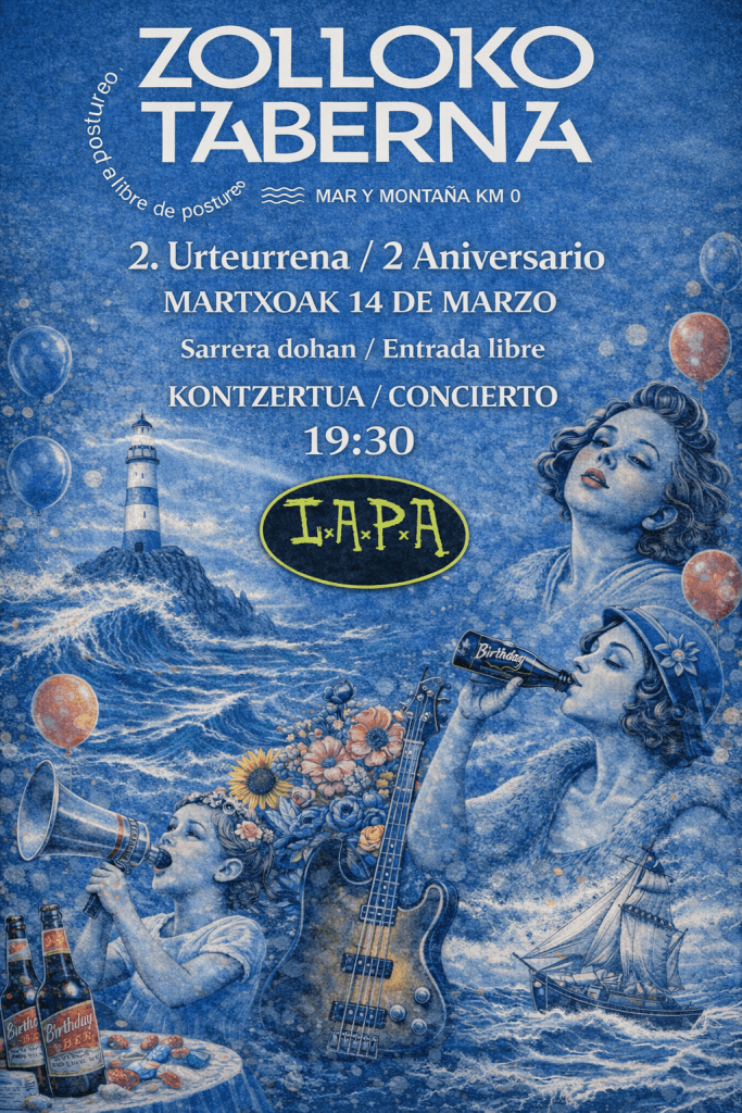 2. URTEURRENA/2 do ANIVERSARIO ETA/Y KONTZERTUA/CONCIERTO Martxoaren 14 Marzo «L.A.P.A.» izango dira, musika zale guztientzat ezinbesteko hitzordua. Ekitaldi honek, gainera, aukera paregabea eskainiko digu taldearen doinu berriak eta klasikoak entzuteaz gain, euren energia eta karisma zuzenean bizi ahal izateko. Musikazaleek zalantzarik gabe disfrutatuko dute momentu paregabe hau, non lagunarteko giroa eta musika bikaina elkartuko baitira. Egun hori, beraz, ez da harritzekoa izango, «L.A.P.A.» taldearen zaleentzat etxean bezala sentituko duten leku bilakatuko delako. Espero dugu ikusi ahal izatea! / Será un evento imprescindible para todos los amantes de la música. Este evento también nos ofrecerá una oportunidad única de escuchar los temas nuevos y clásicos de la banda, así como de experimentar su energía y carisma en directo. Los amantes de la música disfrutarán sin duda de este momento único, donde se fusionarán un ambiente agradable y buena música. Por lo tanto, no será de extrañar que este día se convierta en un lugar donde los fans de la banda «L.A.P.A.» se sentirán como en casa. ¡Esperamos veros!
